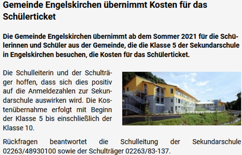 Am 6.1.2021 war der OVZ zu entnehmen: „Die Gemeinde Engelskirchen übernimmt ab kommenden Sommer für die Schülerinnen und Schüler aus der Gemeinde, die die Klasse 5 der Sekundarschule in Engelskirchen-Ründeroth besuchen, die Kosten für das Schülerticket.“