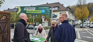 In regelmäßigen Abständen sind wir mit einem Stand auf dem Edmund Schiefeling Platz präsent. Meistens am Samstagmorgen, um mit den Bürgern ins Gespräch zu kommen. Die Resonanz ist unterschiedlich: mal stark, mal weniger, mal positiv. Manchmal werden wir auch beschimpft.