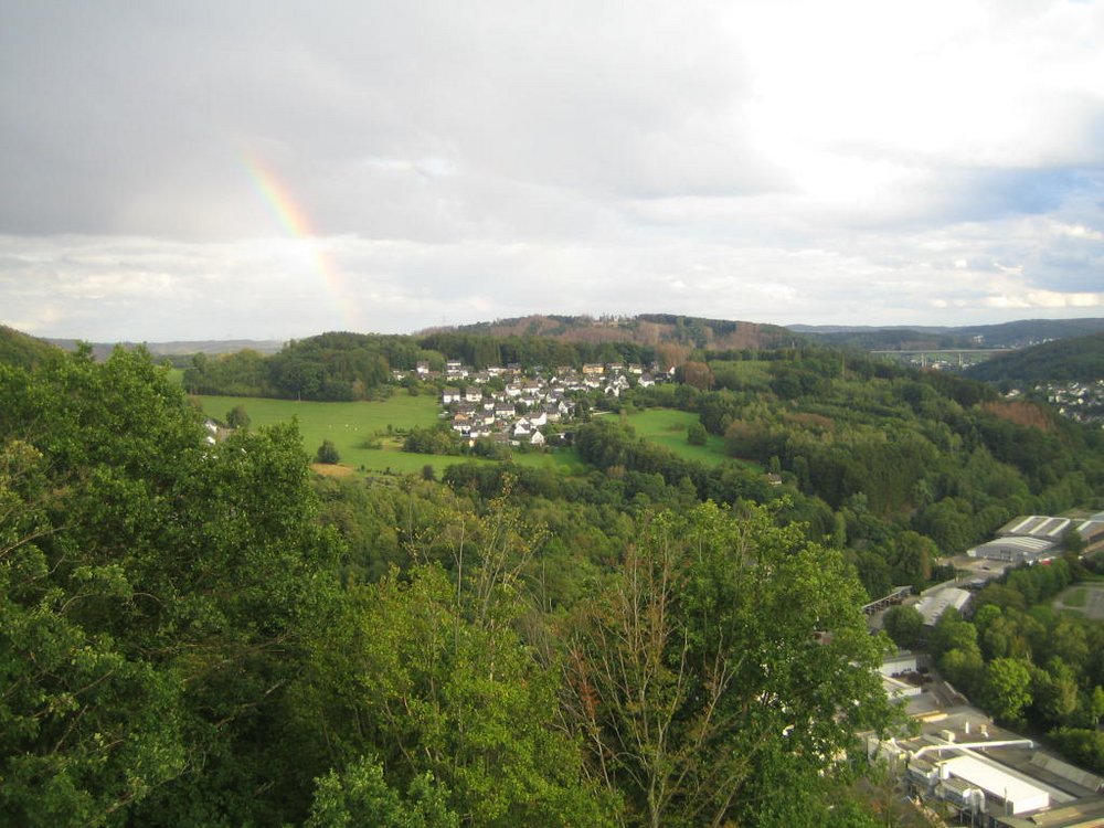 Der Höhlenweg geht auch über den Haldyturm. Von dort kann man das gefährdete Gebiet unterhalb und hinter Buschhausen sehen (Bild) sehen. Der wunderbare Blick von dort ins Aggertal Richtung Wiehlmünden droht erheblich beeinträchtigt zu werden. Neben der Zerstörung des Lebensraums für Pflanzen und Tiere ist auch das ein Argument, von der Landschaftszerstörung in Buschhausen abzulassen.